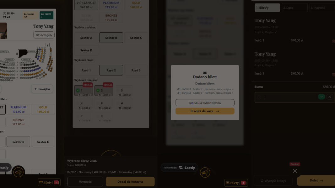 Wdrożenie sprzedaży biletów dla cyklu koncertów fortepianowych. Cel: wygodny wybór miejsc, kody rabatowe, szybkie płatności oraz czytelny panel administracyjny.